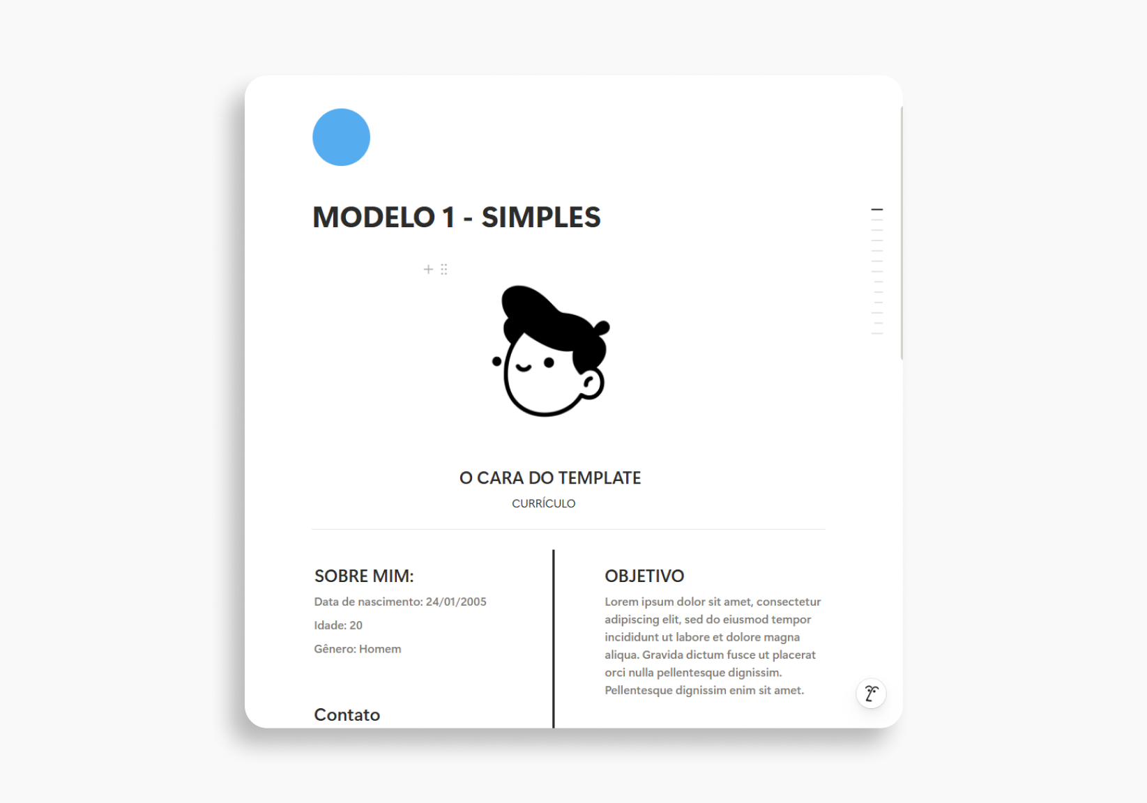 Com visual limpo, estrutura inteligente e uso super intuitivo (nível 1 de 5 de dificuldade), ele ajuda a organizar experiências, formações, habilidades, portfólio e objetivos em um só lugar, pronto para copiar e enviar.